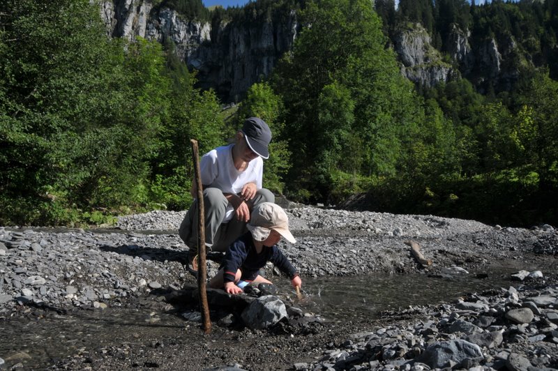 Heute waren wir auf der sagenhaften Druesberghütte. Mama und Papa brachten mich strammen Schrittes die 600m nach oben: Wir liefen den schönen Weg von „Weglosen“ aus, der im Winter ein tolle Schlittenbahn ist. Oben gab’s Sennenrösti, Most und Aprikosenfladen! – Zurück in Weglosen zeigte ich wieder einmal meine Unerschrockenheit kaltem Wasser gegenüber: Ich stand sicher 20 Minuten im Bergbach. Papa staute für mich den Bach und das Wasser wurde immer tiefer.
