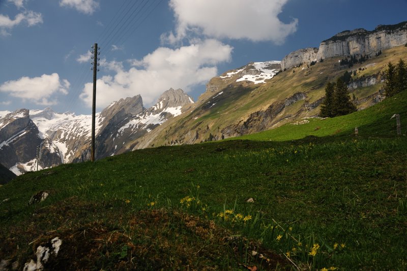 Heute ist ein ganz besonderer Tag für meine Mami: Ihr erster Muttertag. Papi besorgte mit mir zusammen einen grossen Strauss  duftender Rosen. Ich überreichte Mami eine schöne Nelke, die ich, mit charmantem Blick und Lächeln, der Blumenfee abgeluchst hatte. – Es ging in die Berge, ins Gebiet um den grossen Mythen, genauer: ins Gasthaus Holzegg. Dort wurde ich vom Wirt wirklich fürstlich verwöhnt! Nach einem langen Abstieg durch Schneefelder, einem Zwischenstop an einem Wildbach, kamen wir in Brunni an. Dort, ein Blick von Papi und mir zurück. – Danke Mami, für Deinen super Einsatz!